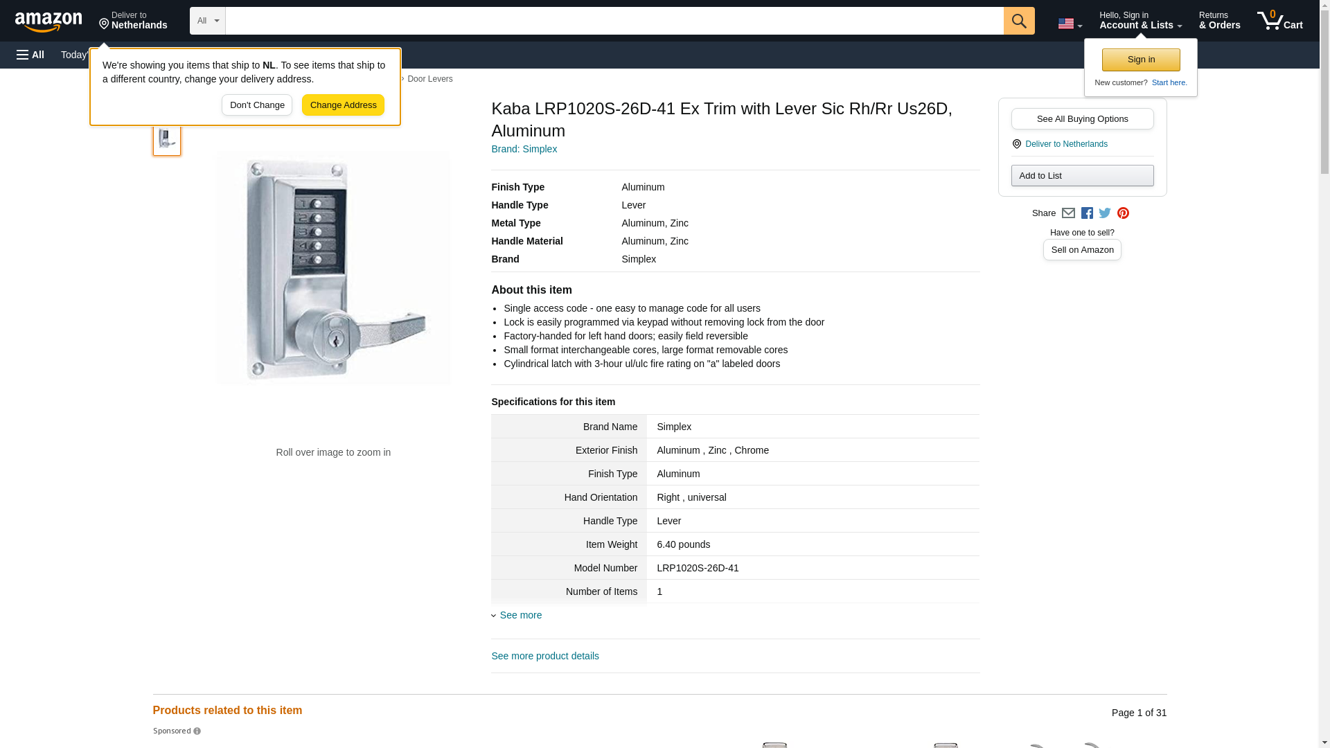 Kaba LRP1020S-26D-41 Ex Trim with Lever Sic Rh/Rr Us26D, Aluminum