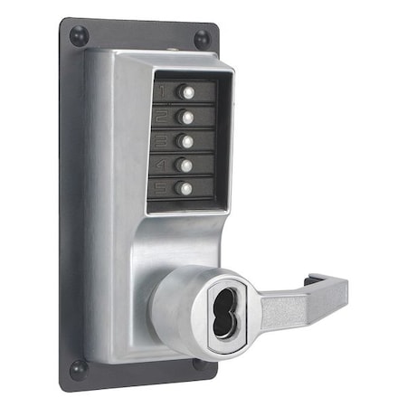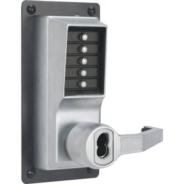 'Mechanical Push Button Exit Trim, Handle Type Lever, Function Entry with Key Override, Key Override Options Replaceable Core Schlage, Hand Right, Finish Satin Chrome, Door Thickness 1-3/8 In. to 2-1/4 In., Keypad 5 Button, Vandal Resistant, ADA Compliant Yes, 3 hr. Fire Rated, Case Material Zinc, Series LP1000, Max. User Codes 1, Weather Resistant Yes, Includes Installation Manual, Full-Scale Template, Combination Change Tool, And Required Lock Installation Hardware Only, Mechanical'