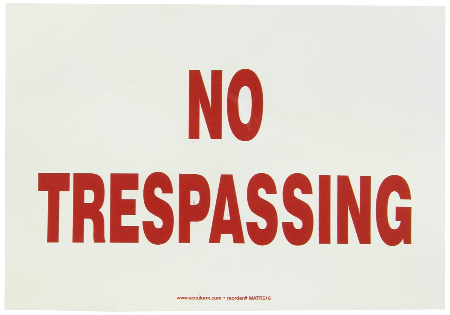 Accuform MATR516VS, 7" x 10" Adhesive Vinyl Sign with Legend: "No Trespassing" No Trespassing sign informs others of restricted access areas. Post entry restrictions to prevent unlawful access Adhesive Vinyl (VS) - Self-stick custom signs. Adhesive Vinyl is a moisture-resistant custom sign material that adheres to almost any flat surface. Adhesive vinyl signs will work for short term outdoor applications, and in moderate temperatures.
