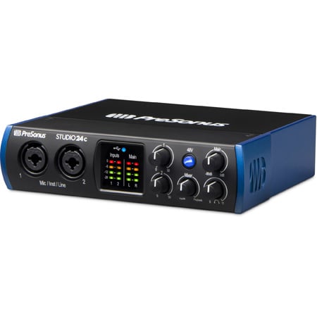 <b>Professional quality in your home recording studio and on the go.</b><br />Great for recording studios, mobile musicians, guitarists, podcasters, and live streaming, the bus-powered <b>Studio 24c</b> 2-in, 2-out audio interface features 2 front-panel combo mic/line/instrument inputs with PreSonus® XMAX-L solid-state mic preamps, 2 rear-panel line outputs, MIDI I/O, and onboard direct monitoring control. A complete, all-in-one home recording studio, the Studio 24c comes with PreSonus' award-winning Studio One® Artist music production software for macOS® and Windows®.</p><p><b>World-class recording software included.</b><br />Seamlessly integrated with the included PreSonus Studio One Artist music production software, the Studio 24c interface works with virtually all macOS and Windows recording software. Easy to learn, Studio One enables you to compose, record, and produce without getting distracted by the tools. Need a new loop or sample for your latest production? Studio One lets you shop, audition, and purchase new content right from your production environment.</p><p><b>Take the tour.</b><br />The 2-in, 2-out Studio 24c audio interface features USB-C computer connectivity and includes combo mic/instrument/line inputs with +48V phantom power for condenser mics; balanced, +-inch TRS, line-level main outputs; and an output level control. Its built-in MIDI interface enables connection to a keyboard, sound module, or control surface. A Mixer knob blends analog input and computer playback for low-latency monitoring.</p><p><b>Superior sound.</b><br />The Studio 24c operates at up to 192kHz for ultra-high-definition recording and mixing. High-quality converters on every input and output and PreSonus' professional-grade XMAX-L mic preamps enable you to capture complex musical harmonics smoothly and naturally, with no audible distortion.</p><p><b>Designed for the home recording studio. Built for the road.</b><br />Whether you're just getting into recording or are a veteran producer who wants to go mobile, the Studio 24c will give you clear, clean, ultra-high-def sound in a bus-powered, rugged unit. While it's a perfect companion for any recording software, the Studio 24c and included Studio One Artist provide you with a complete, affordable, home and mobile recording solution.</p><p><b>Includes Studio Magic Plug-in Suite.</b><br />This suite of plug-ins adds a wealth of fresh sounds and effects to Studio One. Cherry-picked from the first names in virtual instruments and effects, each plug-in brings a different flavor of practical magic to your songs. These plug-ins aren't gimmicky one-trick ponies - these are real-deal workhorses that you'll rely on for countless mixes.</p>