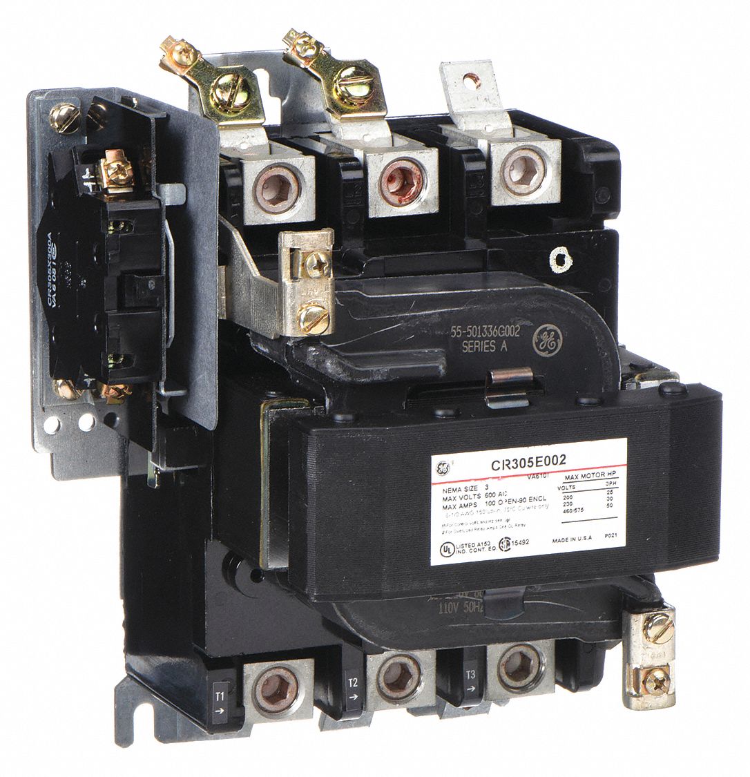 CR305E002 FULL VOLTAGE, NON REVERSING TYPE; NEMA 3 SIZE; VERTICAL MOUNTING; OPEN ENCLOSURE; 100 AMPERE CURRENT RATING; 3 POLE(S); NEMA CONSTRUCTION STANDARD; 110 VAC AT 50 HZ, 115 TO 120 VAC AT 60 HZ COIL VOLTAGE; 1NO AUXILIARY CONTACT; FASTRAC[T] BRAND; NUMBER OF PHASES 3; WITH PRESSURE TERMINAL FOR LINE AND LOAD CONNECTION; CR305 MODEL