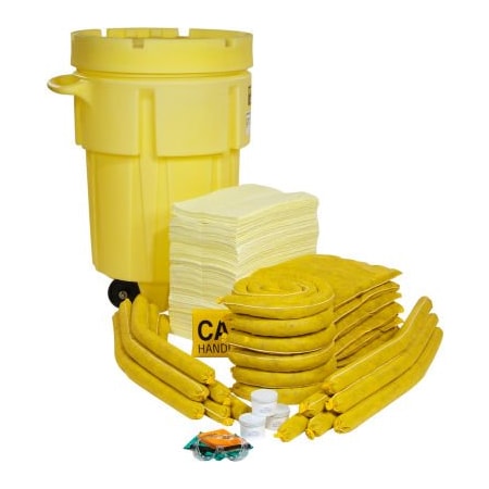 'Spill Kit/Station, Container Type Drum, Spill Control - Fluids Absorbed Chemical, Hazmat, Volume Absorbed Per Pkg. 79.7 gal., Container Capacity 95 gal., Height 36 In., Wheels Yes, Lockable No'