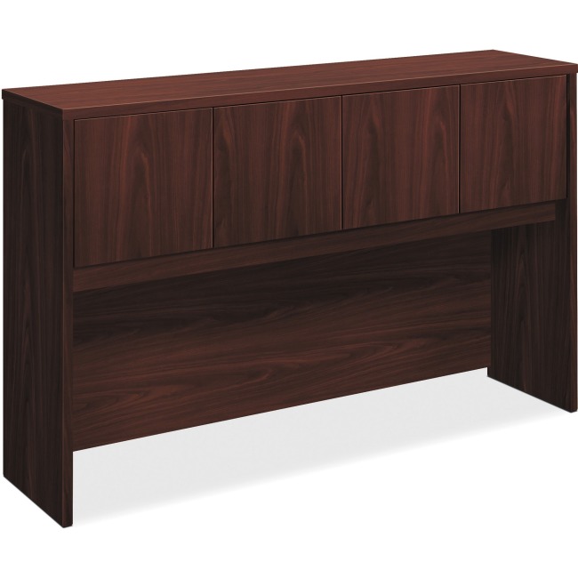 Hutch with four doors is part of the HON Foundation, a versatile collection of laminate desk and storage solutions that can be combined in a variety of ways to fit any work style or space. It fits on the 60" wide Foundation desk or credenza. It can also span an "L" configuration where the width of the return and the depth of the desk or credenza combined equal 60". Surfaces feature attractive, scratch-resistant, stain-resistant, Mahogany thermal-fused laminate for an unbeatable combination of stunning beauty and rugged durability. The durable top and end panels are 1" thick. Fully enclosed back features a grommet to facilitate routing cords.