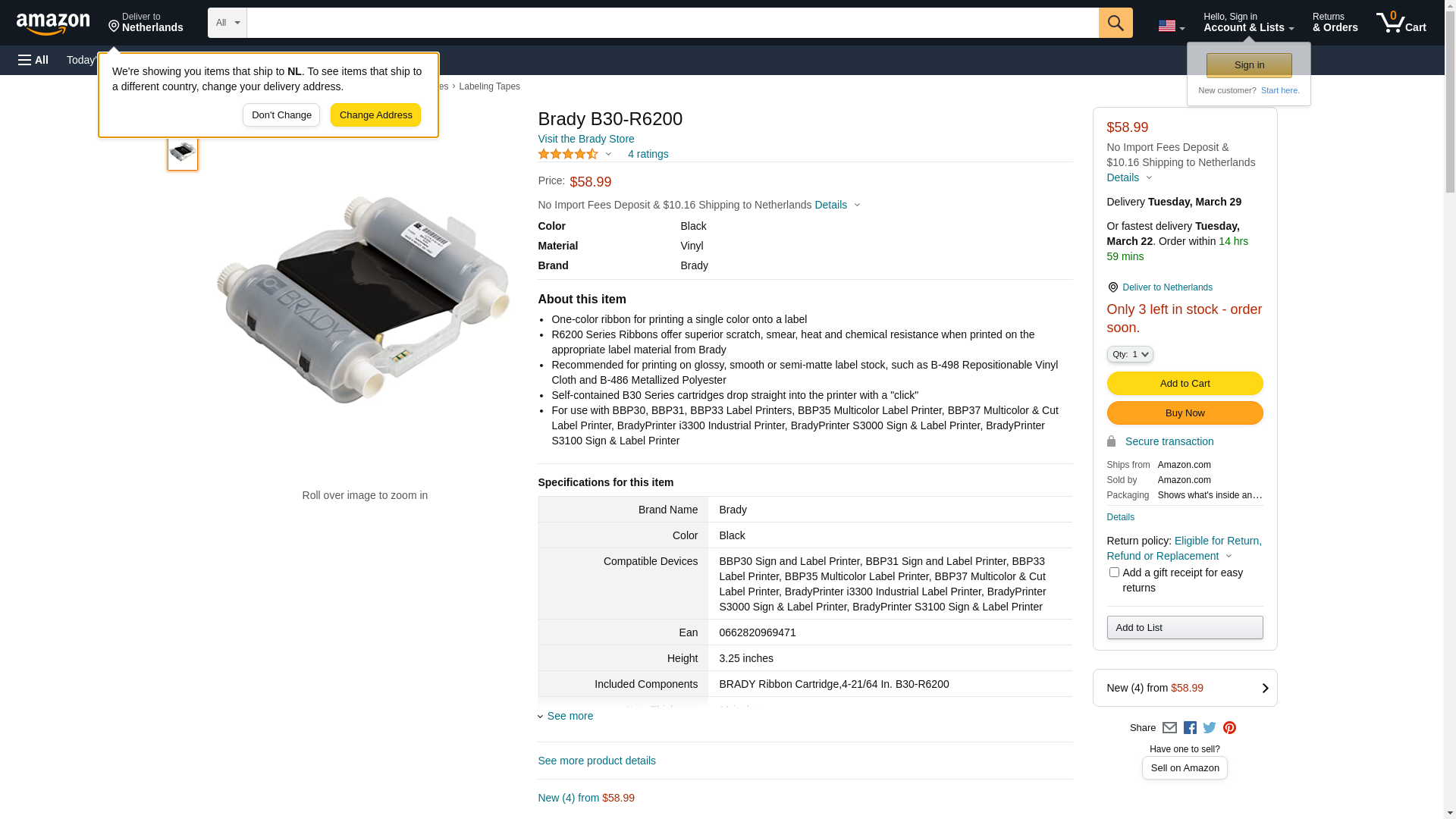Brady B30-R6200, 143119 4.33" x 200' B30 Series R6200 Printer Ribbon, Black, 4 Rolls