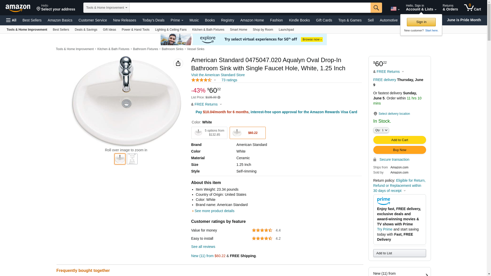 American Standard 0475047.020 Aqualyn Oval Drop-In Bathroom Sink with Single Faucet Hole, White, 1.25 Inch