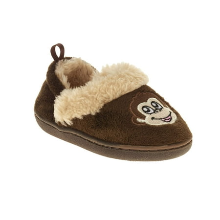 <br /> <b>Infant Boys' Monkey Slipper:</b> <ul> <li>100% polyester upper </li> <li>85.37% polyester, 14.63% TPR outsole </li> <li>Slippers </li> <li>Plush fabrication </li> <li>Embroidered monkey face on upper </li> <li>Plush lining </li> <li>Skid-resistant outsole </li> <li>Heel loop </li> <li>Round toe </li> <li>Available in brown </li> <li>Wipe clean with a cloth</li> </ul><p>Country of Origin: Imported