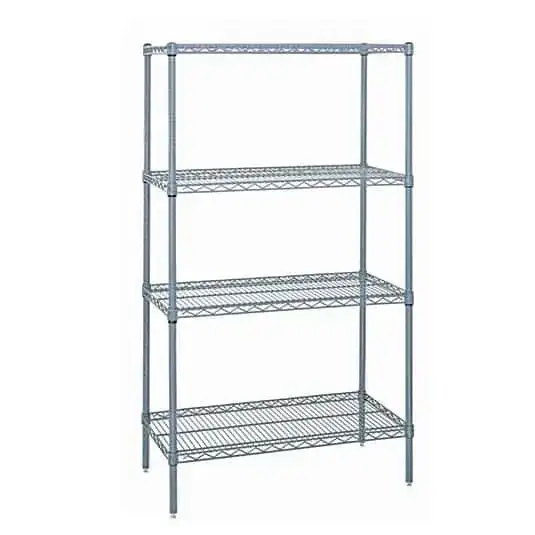 Quantum brand modular wire systems shelving units are designed in various styles and designs and are NSF approved. These Quantum Food Service shelves are made to withstand daily industrial and commercial use. Most rack units are designed with adjustable shelves so you can position every shelf with the optimal space required. You'll find Quantum Storage shelves at restaurants, warehouses, storage spaces, stores, garage racks, or even in home kitchens. Just combine the shelf with post sizes in many finishes to compliment your space. Fast easy assembly in minutes. Just connect the split sleeve with our grooved numbered posts and you are ready to stack the racks. All welded shelf construction is combined with architectural wire trusses to provide incredible solid 800 lb support per shelf. Our starter kits come with 4 posts and 4 shelves. Wire allows air to circulate for minimal dirt accumulation. All units come with our 1 Year warranty against defects.