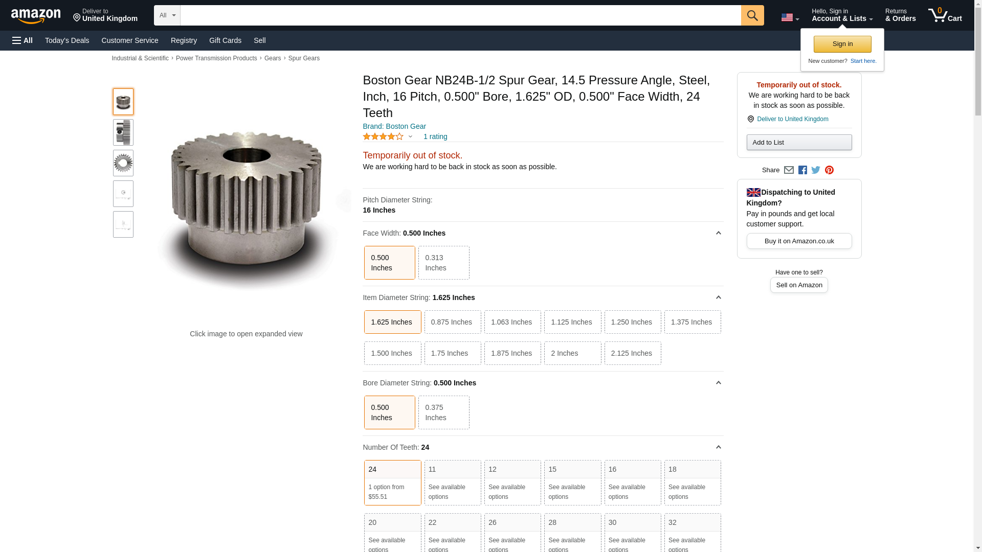 Boston Gear NB24B-1/2 Spur Gear, 14.5 Pressure Angle, Steel, Inch, 16 Pitch, 0.500" Bore, 1.625" OD, 0.500" Face Width, 24 Teeth