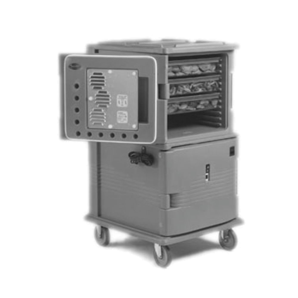 Perfect for frequent opening and closing, extreme cold ambient temperatures and longer events. Extends hot food holding time and ensures food safety - an economical alternative to large warming cabinets. Enables HACCP compliance by maintaining safe, hot food temperatures. Gentle, 150 deg.165 degrees F heat will not cook food and maintains food moisture. 45-minute preheat time from room temperature. Three minute recovery after the door is opened and closed. Tough, polyethylene exterior stays cool to the touch. Thick foam insulation retains temperatures for hours, even when unplugged. Uses less energy than three standard 100 watt light bulbs. Versatile transporter holds a wide variety of food types and textures such as pasta, bone-in fried chicken, and double-crusted pies. Removable cord stows securely for transport. Heated door kits also sold separately to retrofit old units. Electrical Specifications: 110V, 4.6 Amps, 529 Watts, 50/60 Hz, Nema 5-15P Plug, 9 Ft. power cord. Full Size Food Pan Holding Capacity: (24) 2-1/2" deep or (16) 4" Deep or (12) 6" Deep or (8) 8" Deep Tray Capacity (Based on 3" spacing between trays) (48) Camtray Model 3253 or (24) Camtray Model 2025.