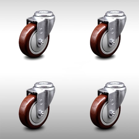 Stainless Steel Polyurethane Swivel Bolt Hole Caster Set of 4 w/4" x 1.25" Maroon Wheels - Includes 4 Swivel - 1400 lbs Total Capacity - Service Caster Brand