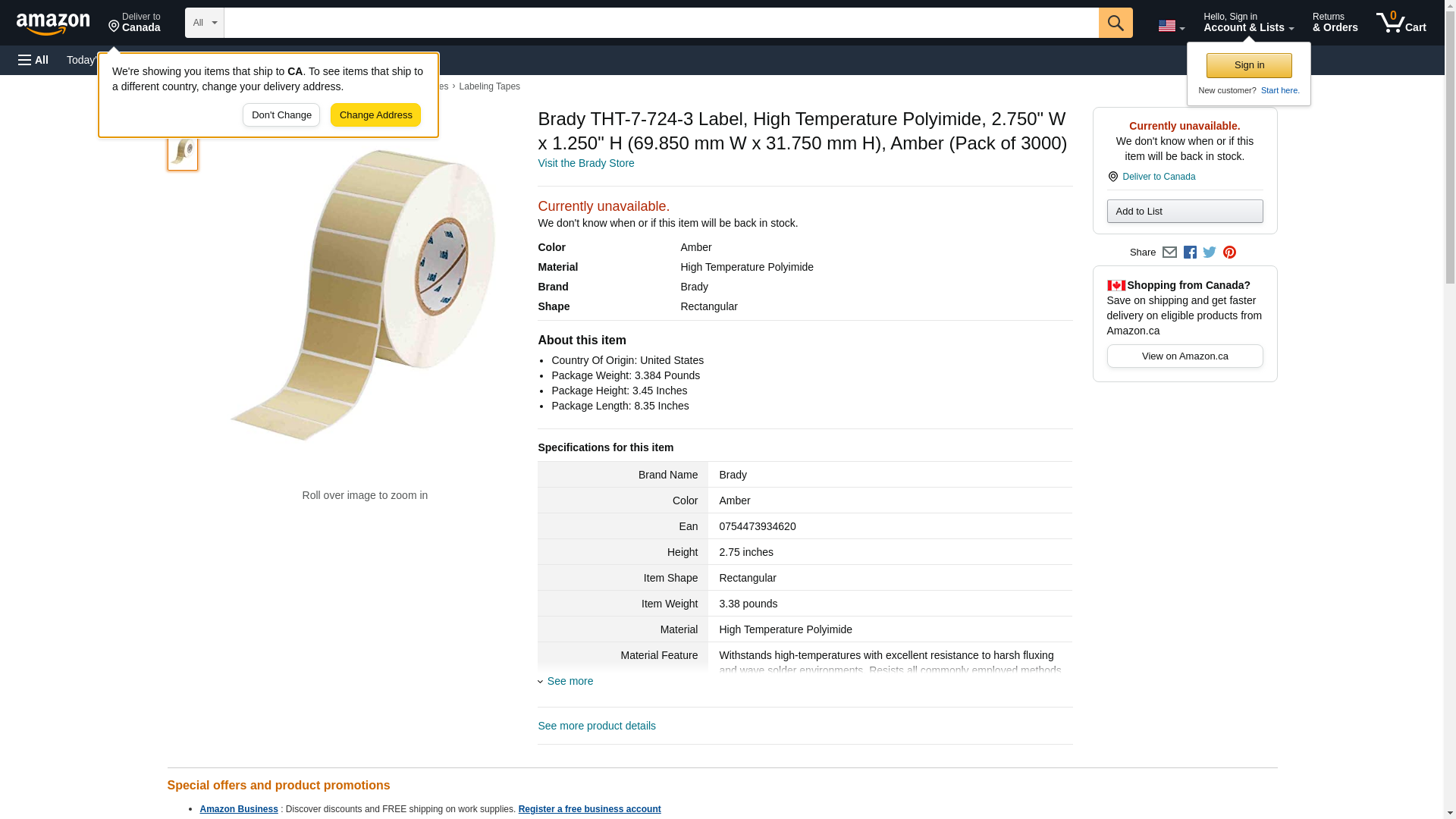 Brady THT-7-724-3 Label, High Temperature Polyimide, 2.750" W x 1.250" H (69.850 mm W x 31.750 mm H), Amber (Pack of 3000)