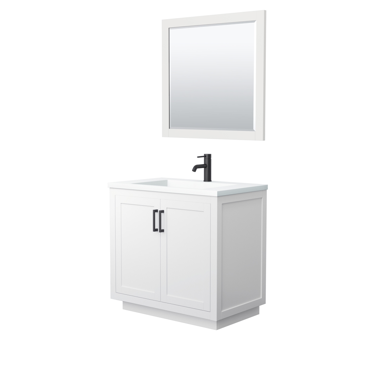 Miranda 36 Inch Single Bathroom Vanity in White, 1.25 Inch Thick Matte White Solid Surface Countertop, Integrated Sink, Matte Black Trim, 34 Inch Mirror