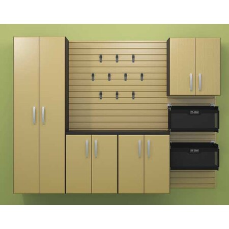 FCS-9612-6M-5M2 Finish: Maple Features: -Panel holds 100 lbs per sq ft. Cabinets hold 50 lbs per shelf including the base. Hooks and bins have individual weight ratings.. -Strong powder coated steel hooks. Product Type: -Complete storage system. Mount Type: -Wall mounted. Primary Material: -Manufactured Wood. Shelves Included: -Yes. Drawers Included: -Yes. Dimensions: -Tall Cabinet: 72" H x 24" Wx 16" D. Includes 3 shelves.. Overall Height - Top to Bottom: -72". Overall Width - Side to Side: -96". Overall Depth - Front to Back: -17". Overall Product Weight: -206 lbs.