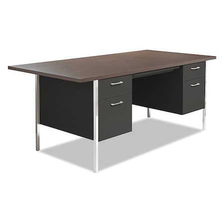 Durable square edge laminated top is scratch- and stain-resistant. Powder coated steel frame with chrome-plated 1" square tubular steel legs. Full-extension locking file drawer with telescoping ball bearing slides accommodates hanging file folders. Box drawer with dividers operates on steel roller suspensions. Center drawer lock secures all drawers. Aluminum drawer handles. Three-quarter height modesty panel provides privacy. Leveling glides adjust for uneven floors. Color: Black; Walnut; Pedestal Count: 2; Top Shape: Rectangular. Part Numbers:ALE-SD7236BW ALERA DOUBLE PEDESTAL STEEL DESK, METAL DESK, 72W X 36D X 29-12H, WALNUTBLACK UPC: 042167400453