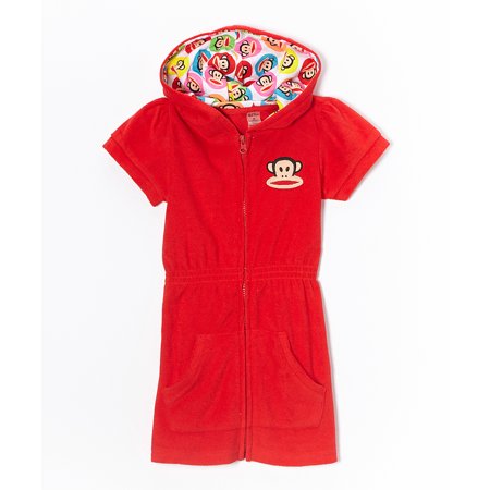 <ul> <li>Girls Paul Frank Zip Hoodie Dress Swimsuit Cover-up Red.</li> <li>Featuring a small embroidered patch of Paul Frank monkey on chest. </li> <li>Zip-up, short sleeve with two front slit pockets.</li> <li>Inside of hood lining has an all-over Paul Frank print pattern.</li> <li>Made to wear as a cover-up/towel after a kid comes out of the water.</li> <li>80% Cotton, 20% Polyester. Very soft, stretchy terry cloth fabric</li> </ul>