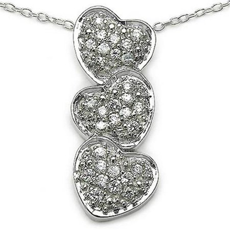 <p>Shower them in love. There's no doubt, when you slip this three heart pendant on your special someone's neck they'll be over the moon with excitement. Imagine presenting this sparkling necklace while the two of you celebrate a major anniversary. With all of the shimmer from the hearts, the love of your life will feel adored for years to come.Spectacular. The 30 prong-set stones on this necklace will knock your socks off. The 0.3 CTW cubic zirconia stones have a very good round cut, white color rating and quintuple AAAAA clarity range. The necklace is cast in 0.925 sterling silver.</p> <b>Features</b> <ul> <li>Layered look creates trendsetter status.</li> <li>30 white cubic zirconia stones.</li> <li>Durability that meets your everyday needs.</li> <li>A price that will feel like it was made for you.</li> </ul> <b>Stone Information</b> <ul> <li><b>Number of Stones: </b>30</li> <li><b>Carat Total Weight (ctw): </b>0.3</li> <li><b>Stone Type: </b>Cubic Zirconia</li> <li><b>Stone Shape: </b>Round</li> <li><b>Cut: </b>Very Good</li> <li><b>Carat Weight: </b>0.3</li> <li><b>Color: </b>White</li> <li><b>Clarity: </b>AAAAA (C.E.)</li> </ul> <b>Mounting Information</b> <ul> <li><b>Metal: </b>Sterling Silver</li> <li><b>Metal Weight: </b>4.28 Grams</li> <li><b>Color: </b>Sterling Silver</li> <li><b>Finish: </b>Polished</li> <li><b>Setting Type: </b>Pave</li> </ul>- SKU: MJTD949