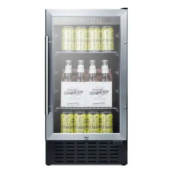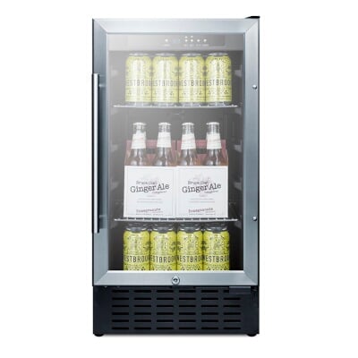 Summit Appliance SCR1841BCSS 18" Wide Undercounter Glass Door All-Refrigerator with Digital Controls, Auto Defrost, Digital Thermostat, Lock, LED Light and Stainless Wrapped Steel Cabinet<br><br> The SCR1841BCSS is an 18" wide all-refrigerator designed for use in residential settings. The front-breathing system allows built-in installation under counters, while the fully finished cabinet also allows freestanding use. Includes a factory installed lock and a professional style handle.<br><br> Key Features<br> - Just under 18" wide for an easy fit, with a flush back design to save space<br> - Flexible design allows built-in or freestanding use<br> - Commercially listed ETL-S to NSF-7 standards and meets UL-471<br> - Stainless steel trimmed triple pane tempered glass door<br> - Environmentally friendly design with no ozone-damaging chemicals<br><br> Specifications<br> - Height of Cabinet: 34.25"<br> - Width: 17.94"<br> - Depth: 23.5"<br> - Capacity: 2.7 cu.ft.<br> - Defrost Type: Automatic<br> - Door: Glass<br> - Cabinet: Stainless Steel<br> - US Electrical Safety. ETL<br> - Canadian Electrical Safety: ETL-C<br> - Sanitation: ETL-S<br> - Energy Usage/Year: 284kWh/year<br> - Amps: 2<br> - Voltage/Frequency: 115V AC/60Hz<br> - Door Swing: RHD<br> - Reversible: Yes<br> - Shelf Type: Chrome<br> - Shelf Qty: 4<br> - Adjustable Shelves: Yes<br> - Thermostat Type: Digital<br> - Fan Type: Interior and Exterior<br> - Refrigerant Type: R600a<br> - Refrigerant Amount: 1.06oz.<br> - High Side PSI: 150<br> - Low Side PSI: 50<br> - Level Legs Qty: 2<br> - Interior Light: Yes<br> - Temperature Range: 34º to 64ºF<br> - Interior: 21"x12.75"x16.75"<br> - Compressor Step: 4.75"x12.75"x4.5"<br> - Weight: 103 lbs.<br> - Shipping Weight: 108 lbs.<br><br>