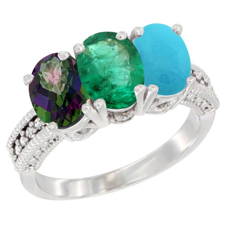 10K White Gold Natural Mystic Topaz, Emerald & Turquoise Ring 3-Stone Oval 7x5 mm Diamond Accent, sizes 5 - 10