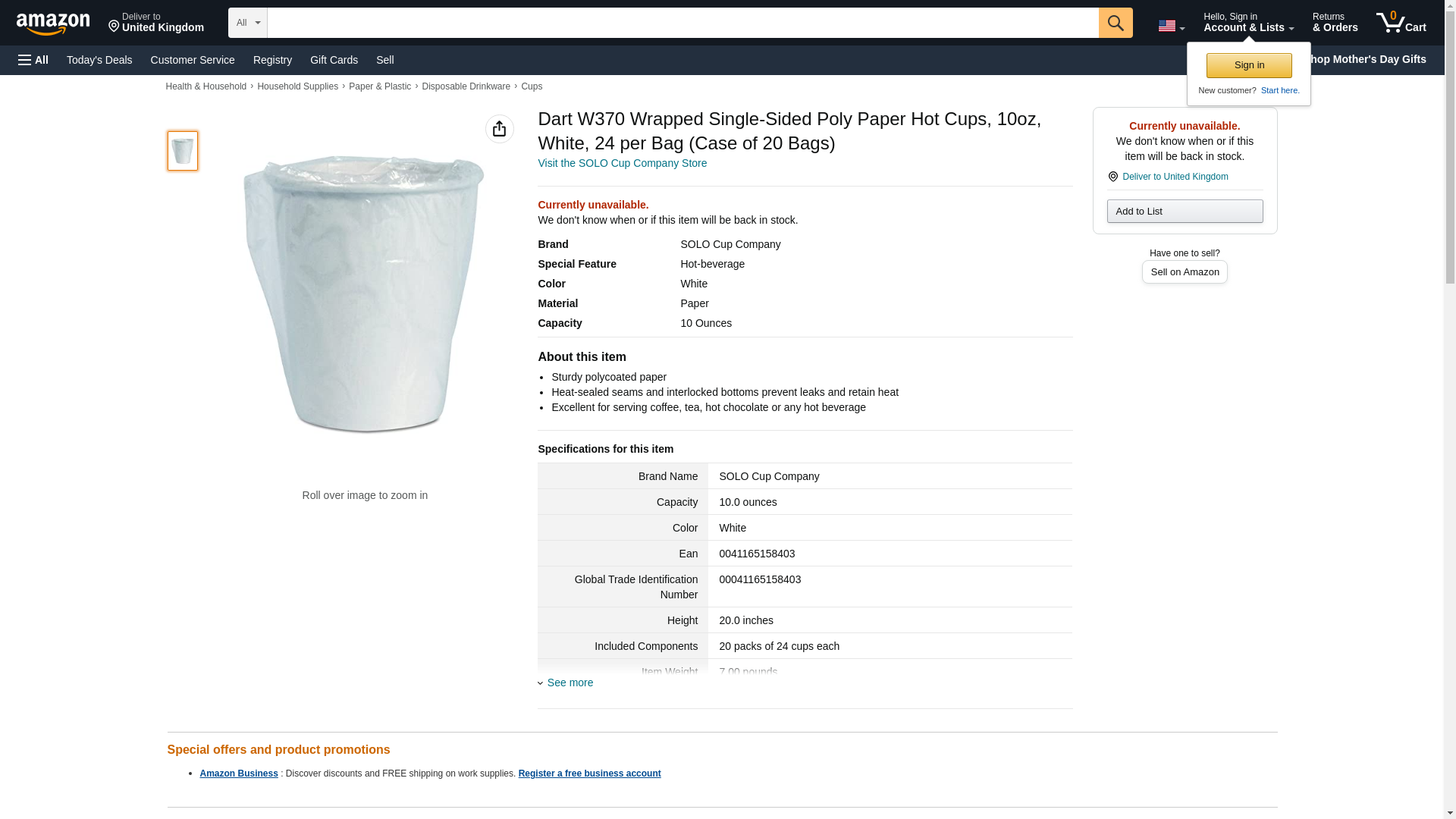 Dart W370 Wrapped Single-Sided Poly Paper Hot Cups, 10oz, White, 24 per Bag (Case of 20 Bags)