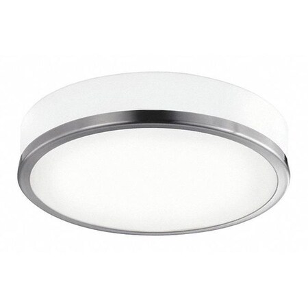Single lamp LED flush mount ceiling fixture with round white opal glass. Metal trim details available in brushed nickel or chrome finish.