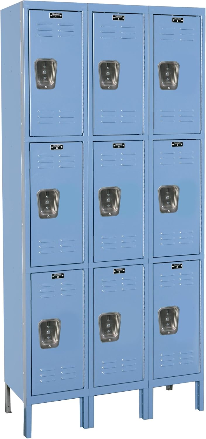 Hallowell Features: -Hallowell Premium Locker. -Finish type: 705 Green Mist, 725 Hallowell Gray, 707 Marine Blue, 727 Maroon, 729 Parchment. -Triple Tier, 3-Wide locker. -Material: Cold Rolled Sheet Steel. -Shipping Type: Assembled. -16 Gauge Louvered Doors, 24 Gauge Body. -Stainless Steel Recessed Handle, 2-Point Gravity Lift-Type Latching. -16 Gauge Continuous Piano Hinge. -Includes 1-Double Hook. -Includes 6" Legs. -2 Year Warranty. -Ships Assembled. -GREENGARD CERTIFIED. U32X8-3A Dimensions (W x D x H): 12" x 12" x 72", Color: Marine Blue