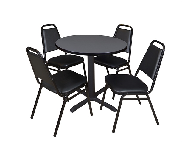 Cain 30" Round Breakroom Table- Grey & 4 Restaurant Stack Chairs- Black