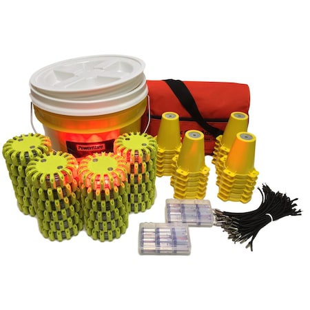 24-Position Cone Kit, contains 24 PF210-R-Y (PowerFlare, Red LEDs, Yellow Shell), 1 BUCKET-24 in Yellow, 24 Cone Top Adapters (CTA-001), 1 Soft Bag for CTAs (holds up to 36), 48 elastic cords for optional use with the CTA-001, and 24 spare batteries