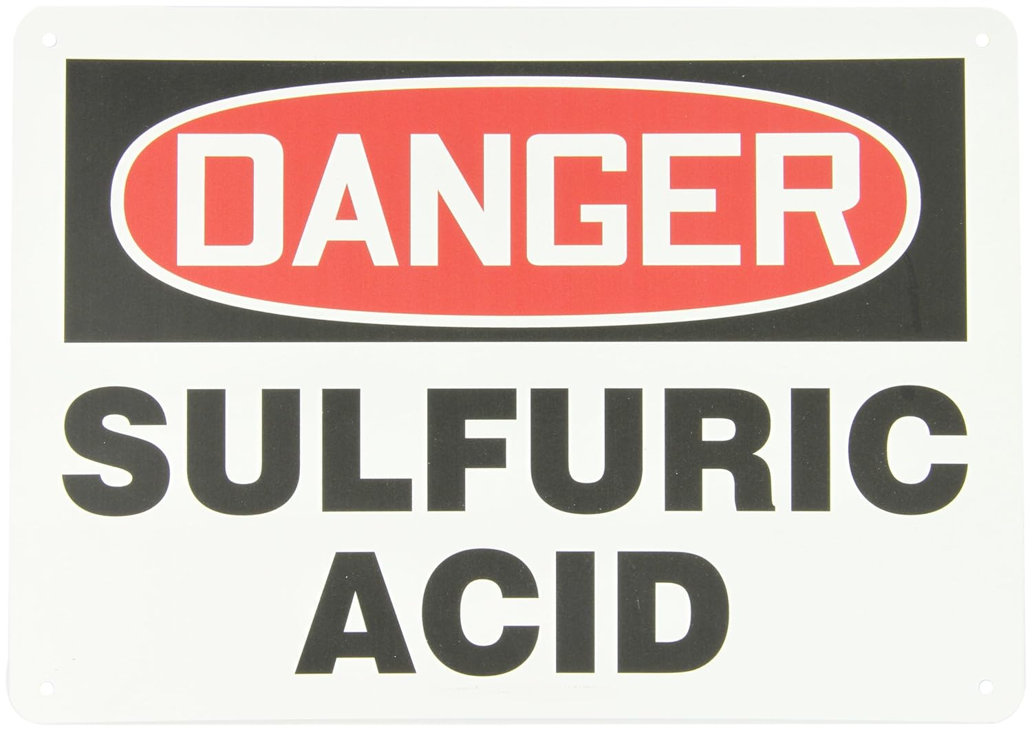 10" x 14" Plastic OSHA Sign with Legend: "Danger Sulfuric Acid" Plastic (VP) Plastic combines standard, reliable performance with 92% recycled content to create a dependable, Earth-friendly material solution. Semi-flexible, impact-resistant plastic signs are ideal for standard-duty use -- for installation indoors and for protected, short-term outdoor applications. Get the look, feel and characteristics of non-recycled plastic signs in an environmentally friendly version.