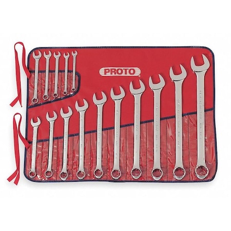 <span>Wrench Sets; Tool Type: Combination Wrench; System of Measurement: Inch; Size Range (Inch): 5/16 - 1-1/4; Number of Pieces: 15; Sizes Included (Inch): 5/16, 3/8, 7/16, 1/2, 9/16, 5/8, 11/16,3/4, 13/16, 7/8, 15/16, 1, 1-1/16, 1-1/8, 1-1/4</span> <table id="idSpecification" style="width: 98%;" border="0" cellspacing="0" cellpadding="3"> <tbody> <tr> <td>Brand</td> <td>Proto</td> </tr> <tr> <td>Tool Type</td> <td>Combination Wrench</td> </tr> <tr> <td>System of Measurement</td> <td>Inch</td> </tr> <tr> <td>Size Range (Inch)</td> <td>5/16 - 1-1/4</td> </tr> <tr> <td>Number of Pieces</td> <td>15</td> </tr> <tr> <td>Sizes Included (Inch)</td> <td>5/16, 3/8, 7/16, 1/2, 9/16, 5/8, 11/16, 3/4, 13/16, 7/8, 15/16, 1, 1-1/16, 1-1/8, 1-1/4</td> </tr> <tr> <td>Number of Points</td> <td>12</td> </tr> <tr> <td>Container Type</td> <td>Vinyl Roll</td> </tr> </tbody> </table>