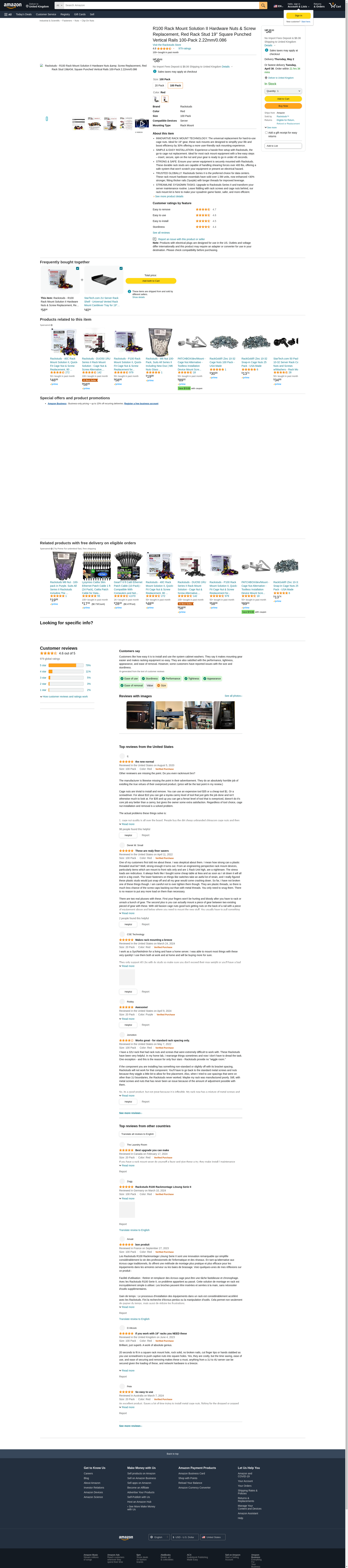 Rackstuds - R100 Rack Mount Solution II Hardware Nuts & Screw Replacement, Red Rack Stud 19" Square Punched Vertical Rails 100-Pack 2.22mm/0.086