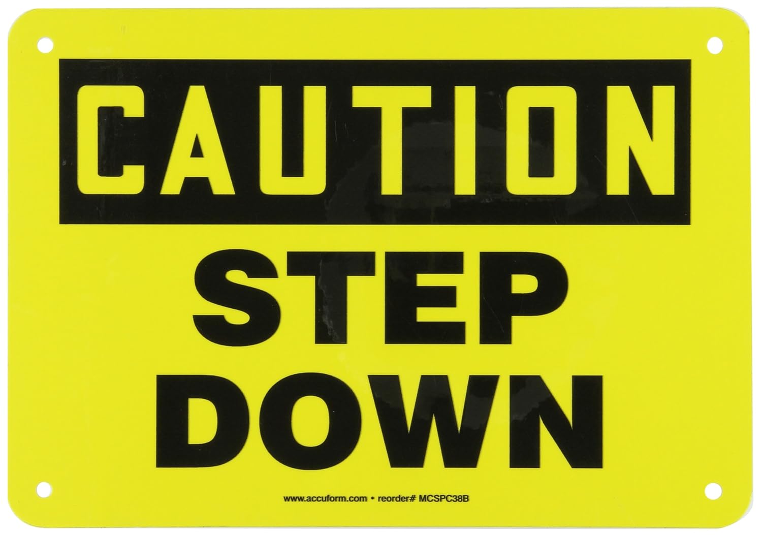 Accuform, MSTF646VA, 7" x 10" OSHA Caution Safety Sign "Step Down" Aluminum Features: UV protective coating Withstands splashes and washdowns Endures outdoor environmental conditions Service temperature range: -40 to 250 F Provides the strength of metal, yet never rusts Rounded corners and 3/16" mounting holes on most sizes, will be adjusted for larger sizes