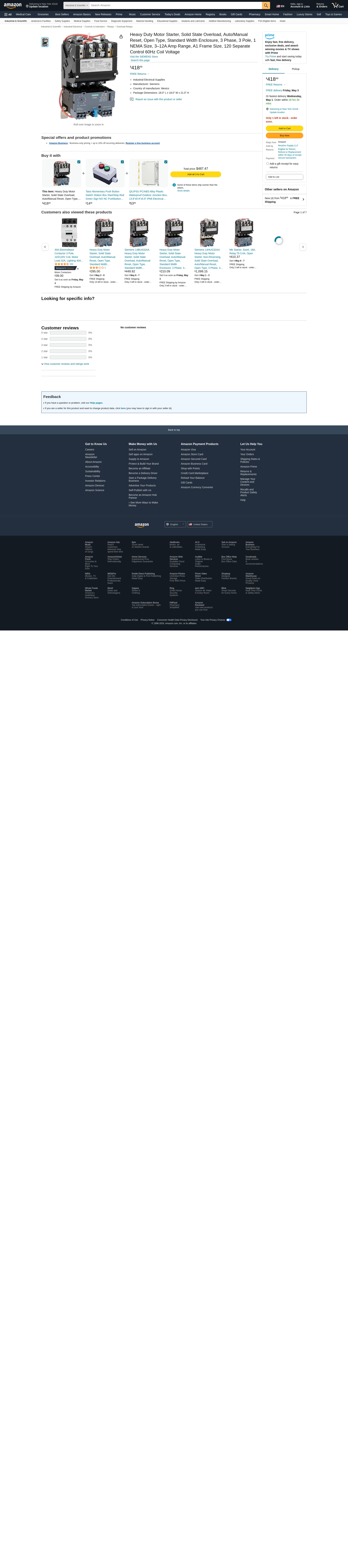 | Feature | <b>Price For:</b> Each <b>Starter Type</b>: NEMA Style <b>Action</b>: Nonreversing <b>Standards</b>: UL, CSA <b>Auxiliary Contact Form</b>: 1NO <b>Item</b>: NEMA Magnetic Motor Starter <b>Number of Poles</b>: 3 <b>HP @ 3 Phase - 575V</b>: 5 <b>HP @ 3 Phase - 480V</b>: 5 <b>HP @ 3 Phase - 240V</b>: 2 <b>HP @ 3 Phase - 208V</b>: 2 <b>Height</b>: 7.44" <b>Depth</b>: 3.75" <b>Enclosure NEMA Rating</b>: No Enclosure <b>Coil Volts</b>: 120VAC |