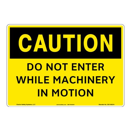 <p><strong>Word Message: </strong><br />DO NOT ENTER WHILE MACHINERY IN MOTION</p><p><strong>Description: </strong><br />Clarion Safety Systems brings you Caution Do Not Enter While Machinery in Motion safety signs (OS1183CH-) which are produced on premium plastic or aluminum material and are designed to meet your OSHA safety sign needs.<p><strong>Material Information:</strong></p> <ul> <li><strong>Material</strong>: (BJ) Indoor/Outdoor Plastic</li> <li><strong>Base Materials</strong>: .060" Rigid White Plastic</li> <li><strong>Overlaminate</strong>: none</li> <li><strong>Mounting Option</strong>: Mounting holes</li> <li><strong>Application</strong>: Indoor/Outdoor</li> <li><strong>MaxTemp</strong> (F): 140</li> <li><strong>MinTemp</strong> (F): 32</li> <li><strong>Chemical Resistance</strong>: Good</li> <li><strong>UV Resistance</strong>: Good</li> <li><strong>Outdoor durability</strong>: Good</li> <li><strong>Storage Stability</strong>: Stable. Optimum storage conditions: 72 F @ 50% relative humidity</li> <li><strong>Expected Life Indoor</strong>: Long term</li> <li><strong>Expected Life Outdoor</strong>: 3-5 year (expected outdoor life may vary due to climatic conditions)</li> <li><strong>RoHS</strong>: Yes</li> <li><strong>CRoHS</strong>: Yes</li> <li><strong>REACH</strong>: Yes</li> </ul>