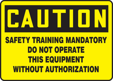 7" x 10" Aluminum Sign: "Safety Training Mandatory Do Not Operate..." Sign: "Safety Training Mandatory Do Not Operate This Equipment without Authorization" Aluminum (VA) Aluminum withstands wash downs, harsh elements, abusive conditions, and features good chemical, abrasion, and impact resistance. Aluminum is excellent for indoor and outdoor usage, making it ideal for a wide variety of industrial-strength applications. All Aluminum signs feature Accuform's TedLex liquid-based UV-protective coating, included at no charge. TedLex is perfect for indoor and outdoor use, prevents fading, and resists chemicals, abuse, and graffiti. Aluminum signs provide the strength of metal, yet never rust. Aluminum withstands wash downs, harsh elements, and abuse.