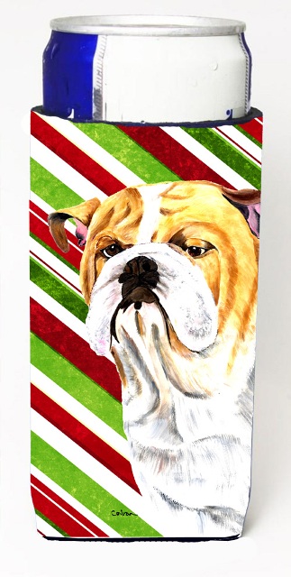 Caroline's Treasures SC9334MUK Bulldog English Candy Cane Holiday Christmas Ultra Hugger for slim cans Can Cooler Sleeve Hugger Machine Washable Drink Sleeve Hugger Collapsible Insulator Beverage Insu