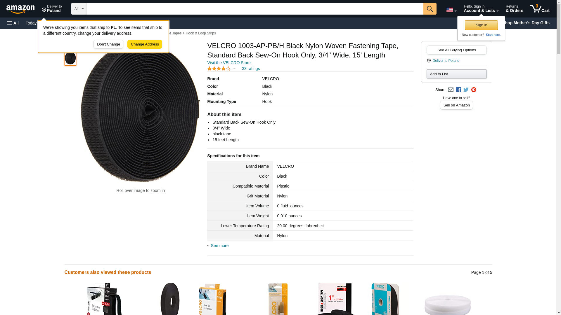 VELCRO 1003-AP-PB/H Black Nylon Woven Fastening Tape, Standard Back Sew-On Hook Only, 3/4" Wide, 15' Length