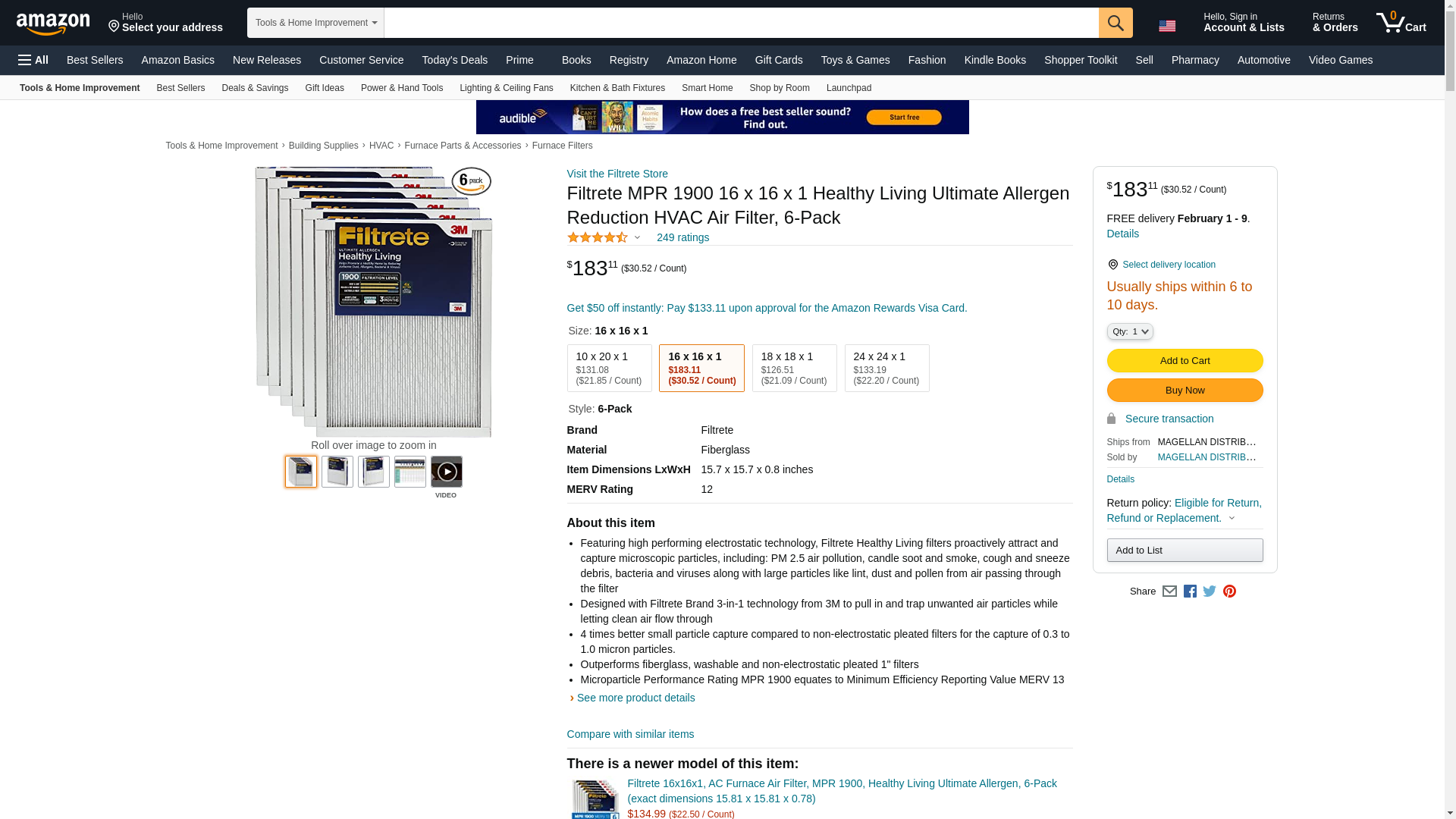 Filtrete MPR 1900 16 x 16 x 1 Healthy Living Ultimate Allergen Reduction AC Furnace Air Filter, Uncompromised Airflow, 6-Pack