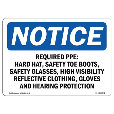 OSHA Notice Sign, Required PPE Hard Hat Safety Toe Boots, 5in X 3.5in Decal