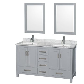 Wyndham Collection Sheffield 60 inch Double Bathroom Vanity in Gray, White Carrara Marble Countertop, Undermount Square Sinks, and 24 inch Mirrors