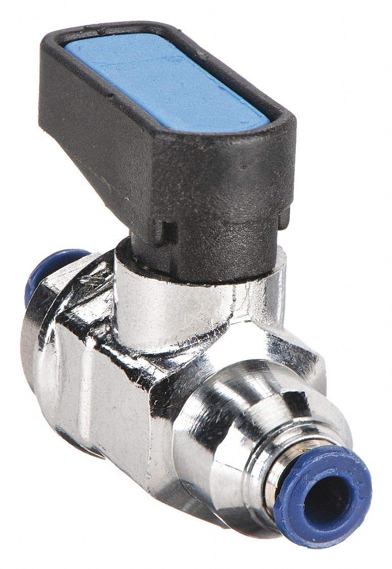'Mini Ball Valve, Push To Connect, Tube Size 1/4 In, Pipe Size 1/4 In, MNPT x Tube Connection, Material of Construction Nickel Plated Brass, Thread Size 1/4 In, Length 1.83 In, Pressure (PSI) 250, Temp Range 0 To 160 Deg F'