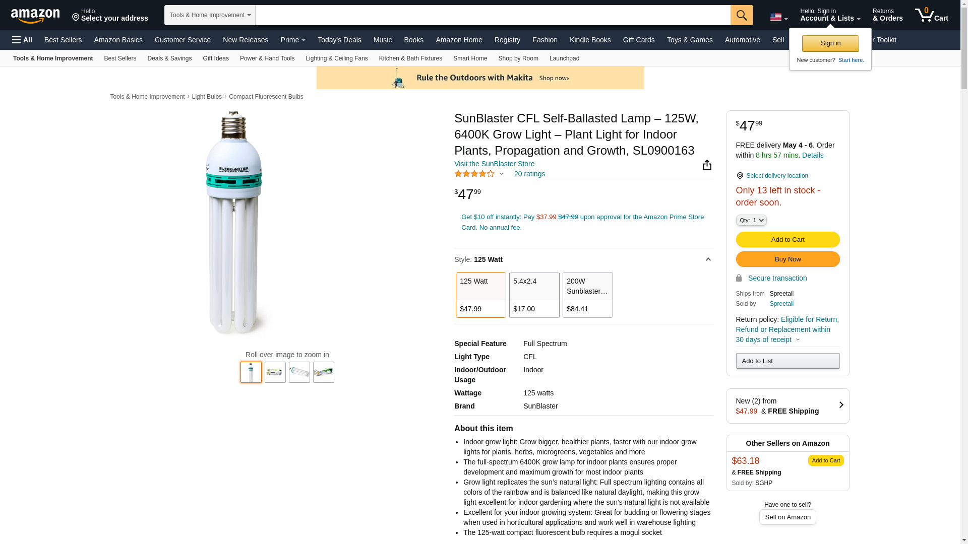 SunBlaster SL0900163 CFL Self ballasted Propagation lamp, White