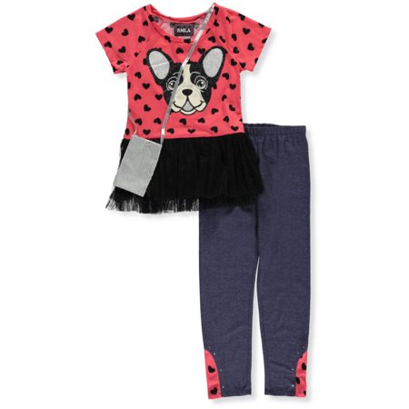 Glam style meets everyday comfort with this 2-piece outfit with purse from RMLA! <ul> <li>RMLA 2-piece outfit with purse</li> <li>Printed jersey top with raglan seaming, glittery chest graphic, and drop waist tulle skirt (100% polyester)</li> <li>Stretch knit leggings with elastic waistband, and contrast graphic panels with stud accents at legs (55% cotton, 40% polyester, 5% spandex)</li> <li>Sequin purse with hook-and-loop closure included</li> <li>Machine wash cold, gentle, inside out</li> <li>Imported</li> </ul>