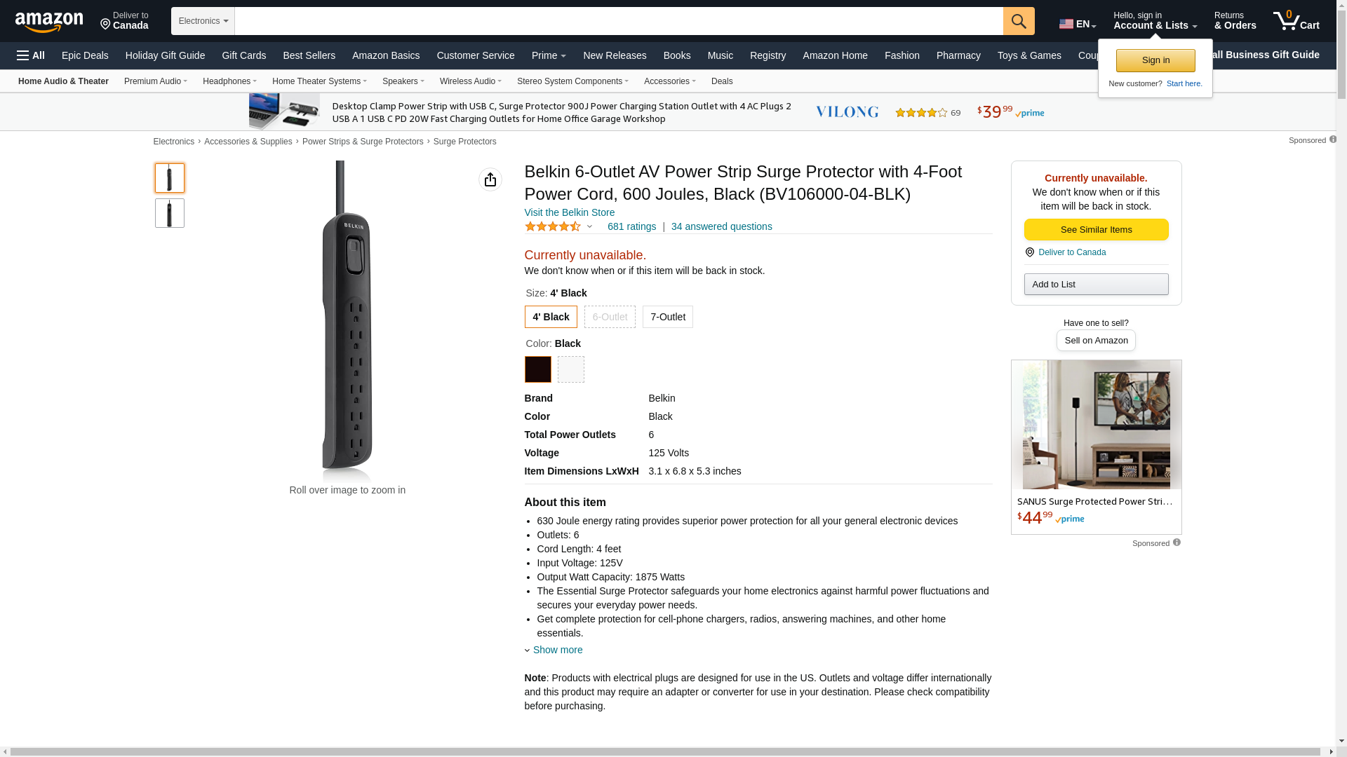 Belkin 6-Outlet AV Power Strip Surge Protector with 4-Foot Power Cord, 600 Joules, Black (BV106000-04-BLK)