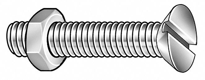 'Stove Bolt, Head Type Flat, Low Carbon Steel, Length 1-1/4 In., Thread Length 1 In., Drive Type Slotted, Finish Zinc, Thread Size 3/16-24, Driver Size 5/16 In., Head Dia. 0.362 In., Head Height 0.116 In., Head Angle (Deg.) 82, Hole Size 7/32, Temp. Range (F) 0 - +375, Tensile Strength (PSI) 60, 000, Rockwell Hardness B70-100, Meets/Exceeds ASME B18.6.3, Includes Matching Hex Nut, Package Quantity 100'