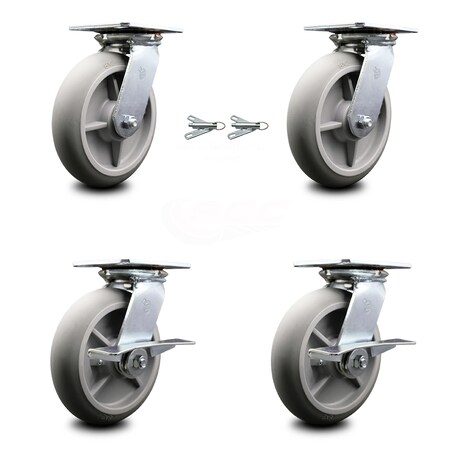 Heavy Duty Large Top Plate Thermo Rubber Donut Tread Swivel Caster Set of 4 w/8" x 2" Gray Wheels- Includes 2 Swivel with Bolt on Swvl Lcks&2 Swvl with Brakes-2400lbs Total Cpty - Service Caster Brand