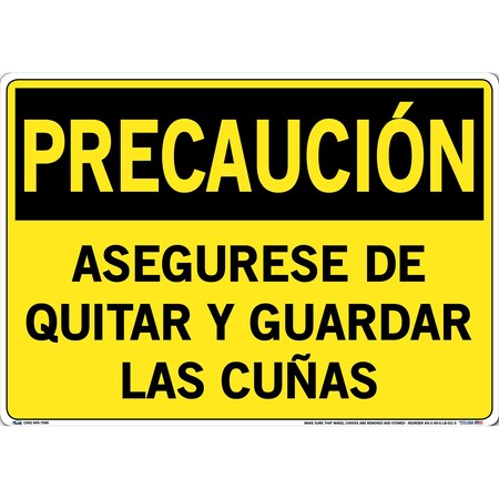 Vestil Caution Label SI-C-69-E-LB-011-S Vinyl .011" overall size 20.5"W x 14.5"H MAKE SURE THAT WHEEL CHOCKS ARE REMOVED AND STOWED, ASEGURESE DE QUITAR Y GUARDAR LAS CUÑAS