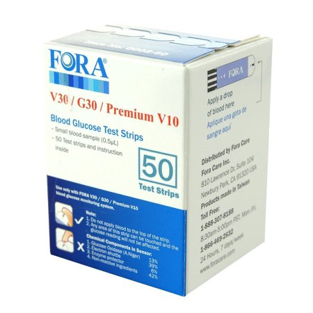 <p>FORA V30/G30/PremV10 DME Test Strips, 50 Strips</p> <p>Compatible with ForaCare V30, G30 & Premium V10 Meters;Quick blood absorption design;Smart circuit design for a quick insert and simple start;Patented partial hydrophilic layer for enhanced accuracy;Tiny Blood Sample</p>