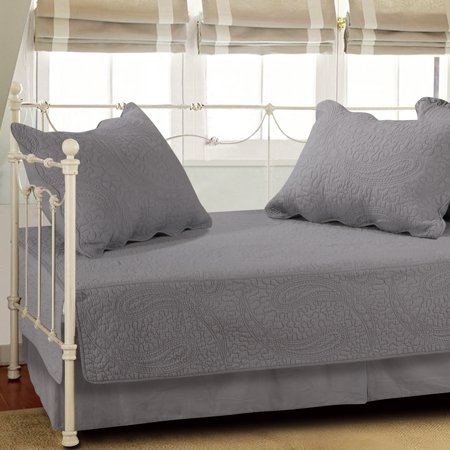 <ul> <li>5-Piece Daybed Set fitted quilt, 3 pillow shams and a bed skirt. Size 39x75+12+20x26 (3)+39x75+15".</li> <li>Quilt,Shams: Shell 100%cotton; 60%cotton 40%polyester.Skirt: Drop 100%cotton; Platform 100%polyester</li> <li>Finely quilted in a paisley pattern for casual sophistication.</li> <li>Shams feature cloth ties to hold pillow in place.</li> </ul>