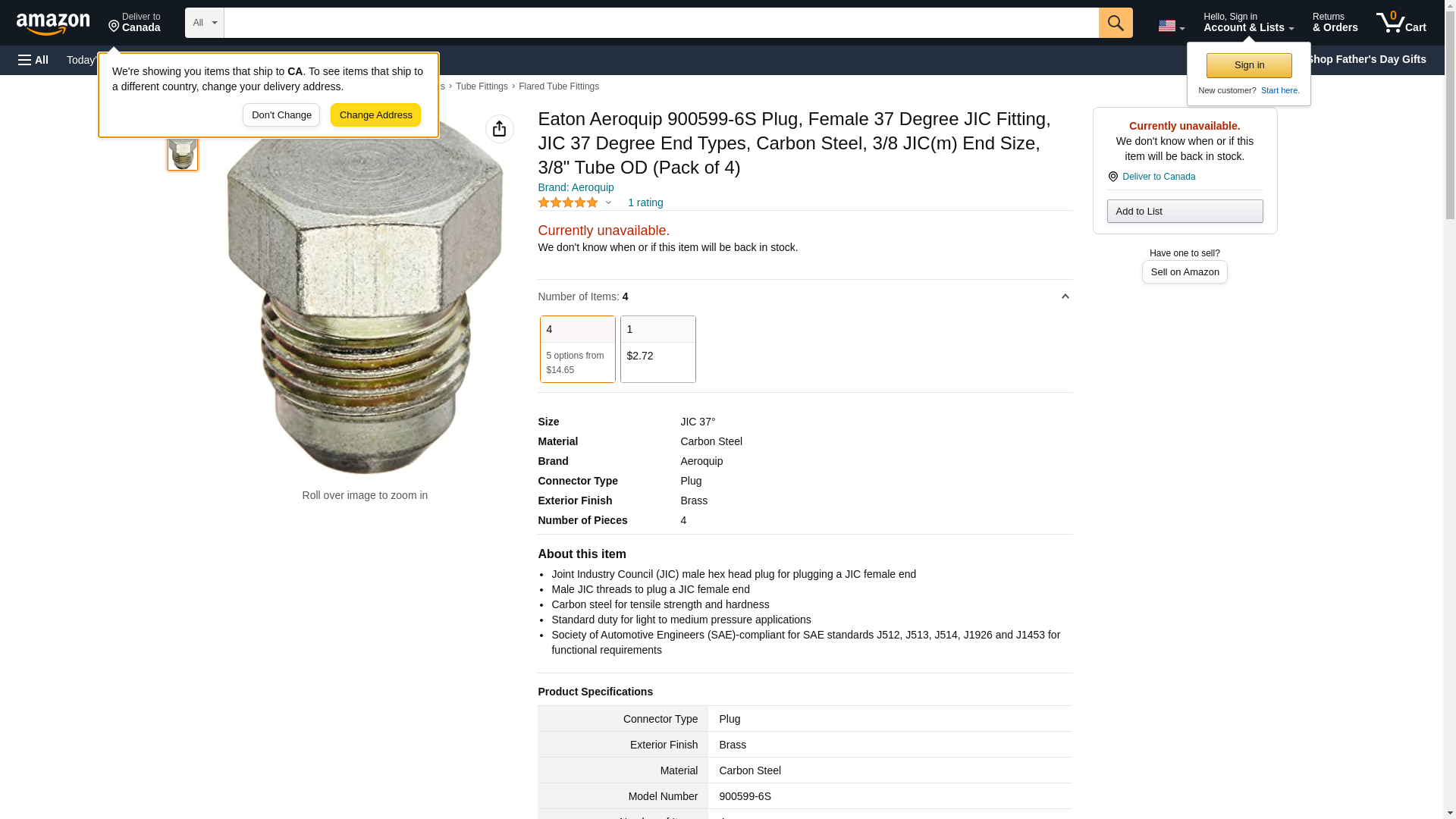 Eaton Aeroquip 900599-6S Plug, Female 37 Degree JIC Fitting, JIC 37 Degree End Types, Carbon Steel, 3/8 JIC(m) End Size, 3/8" Tube OD (Pack of 4)
