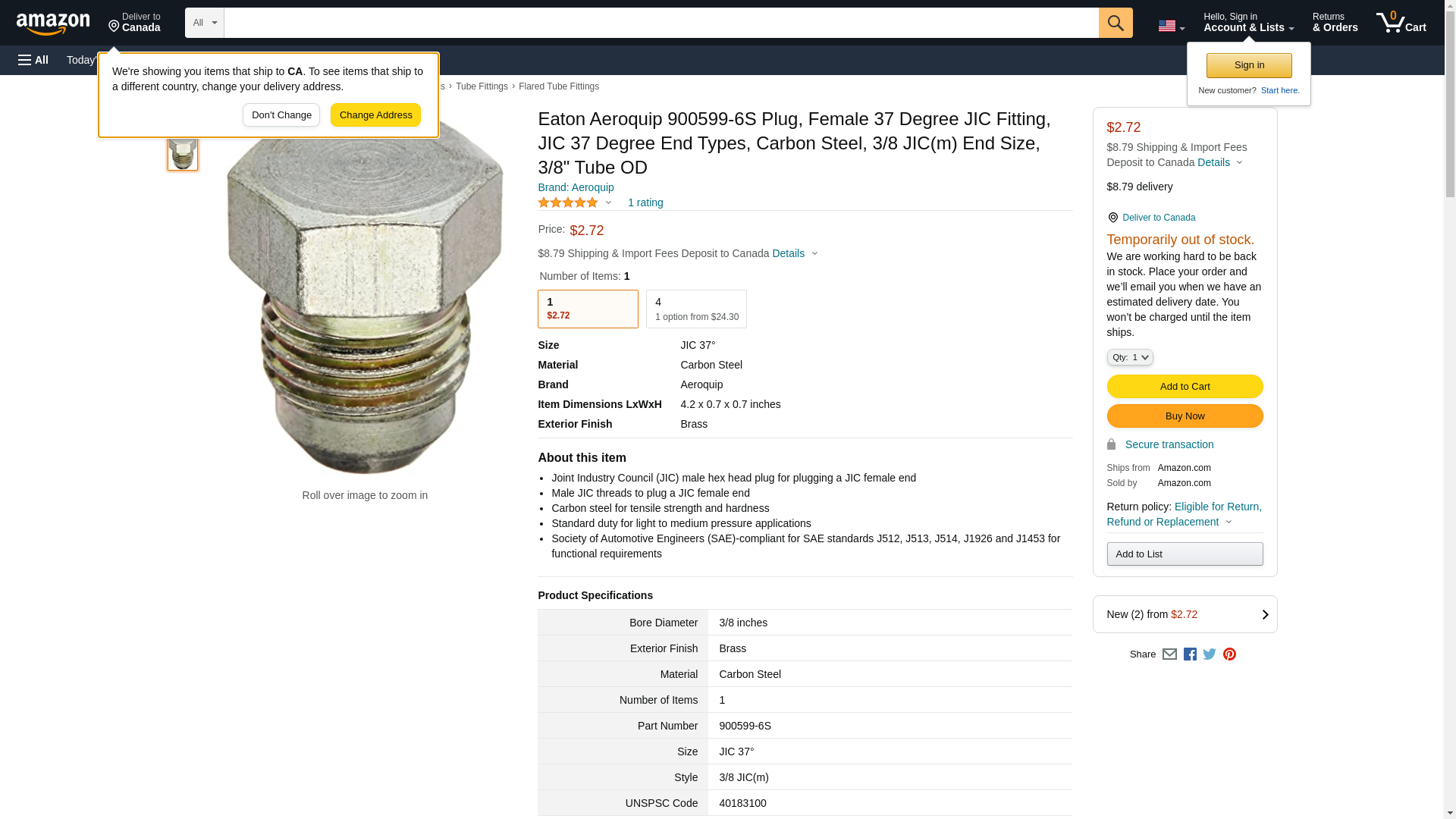 Eaton Aeroquip 900599-6S Plug, Female 37 Degree JIC Fitting, JIC 37 Degree End Types, Carbon Steel, 3/8 JIC(m) End Size, 3/8" Tube OD